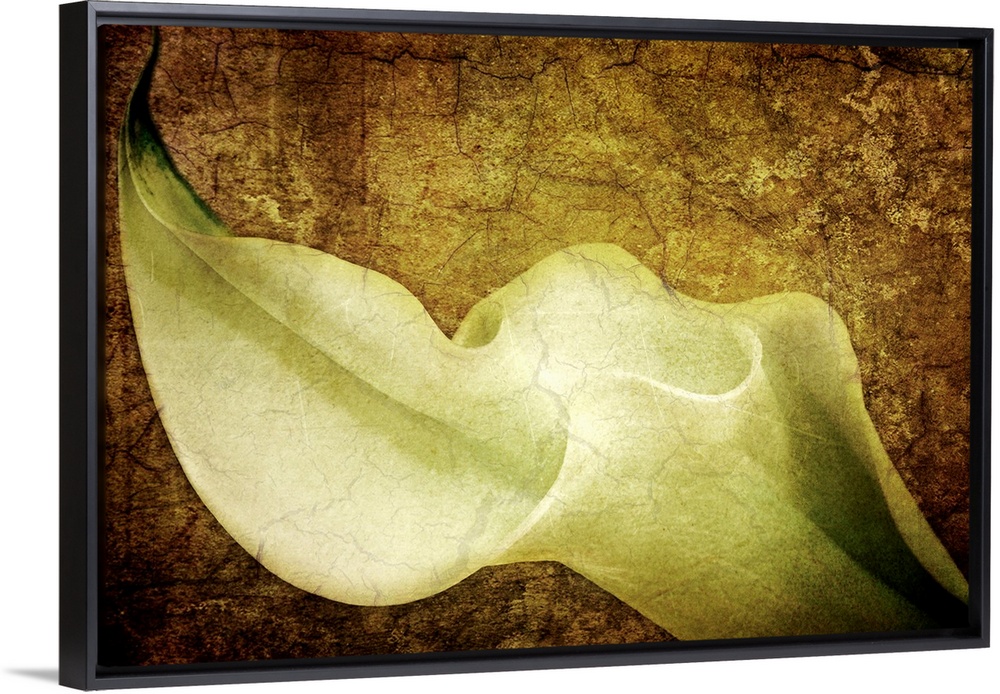 <p>A photograph of a calla lily collaged over a texture of cracking paint and other tints to this memento mori artwork.</p>