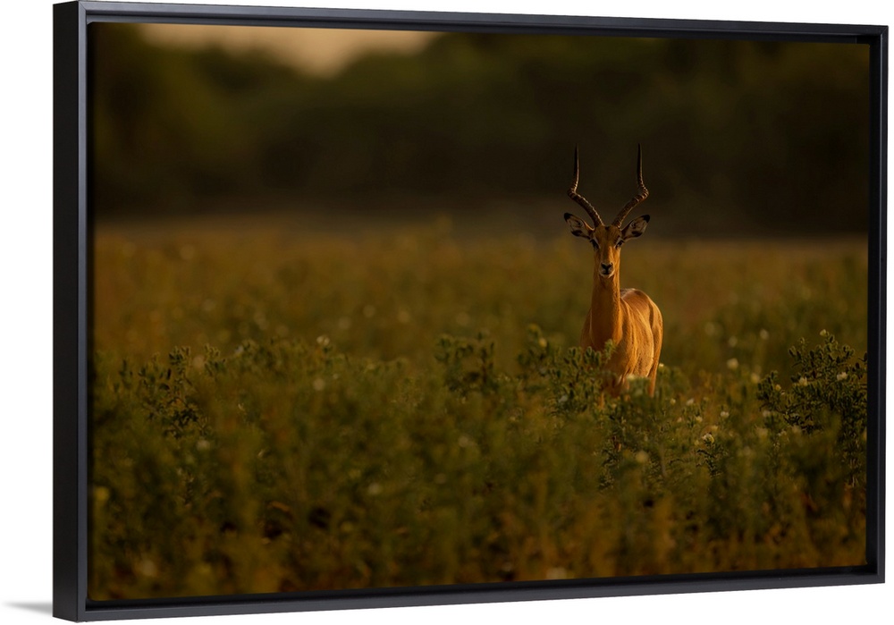<p>A male common impala, (Aepyceros melampus) stands among tall plants in the savanna, staring at the camera in Chobe National Park, Chobe, Bostwana</p>