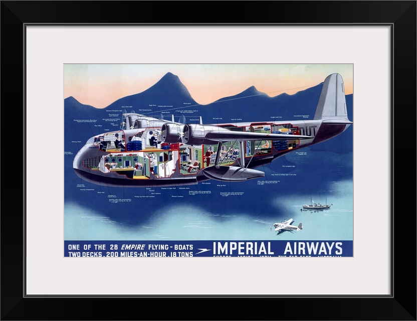 <p>Classic advertisement for Imperial Airways showing the two-deck layout of a flying boat in a cutout fashion.</p>