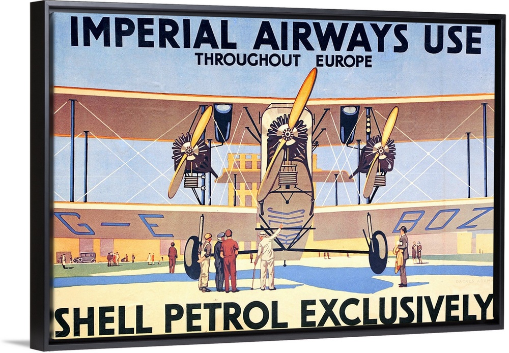 <p>Shell petrol advertisement from the late 1920s, showing Imperial Airways' Armstrong Whitworth Argosy airliner G-EBOZ at Croydon Aerodrome.</p>