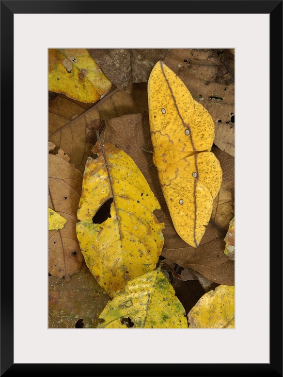 <p>Imperial Moth (Eacles imperialis) camouflaged in leaf litter in rainforest, Yasuni National Park, at 982,000 hectares, the largest national park in Ecuador</p>