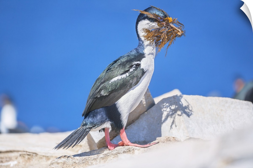 <p>Imperial shag (Leucocarbo atriceps) carrying nesting material, Sea Lion Island, Falkland Islands, South America</p>