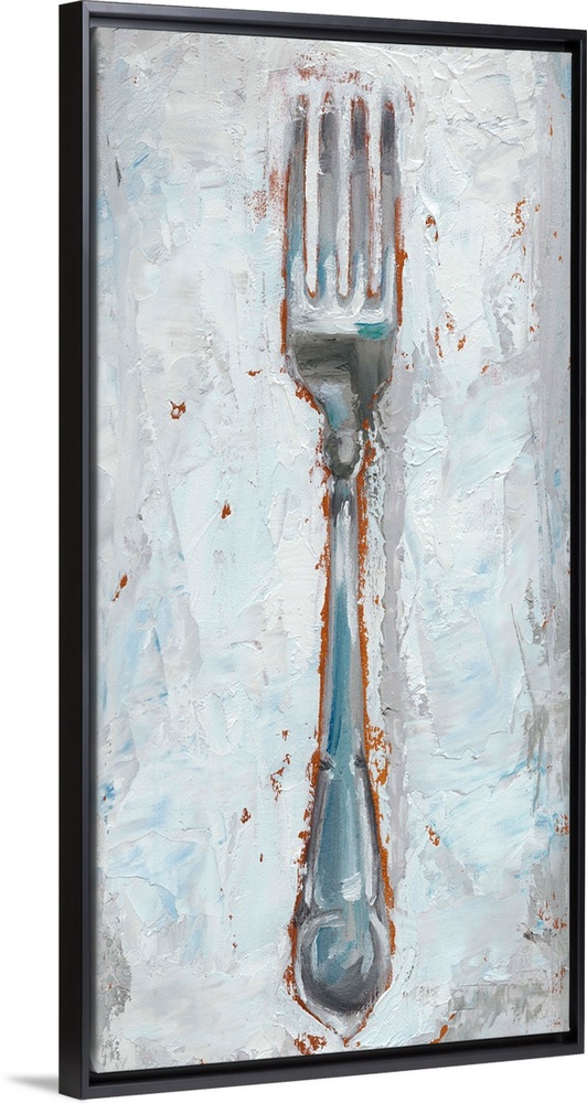 <p>Rustic painting of a fork made in cool tones with warm hints of orange popping out from underneath the layered paint.</p>