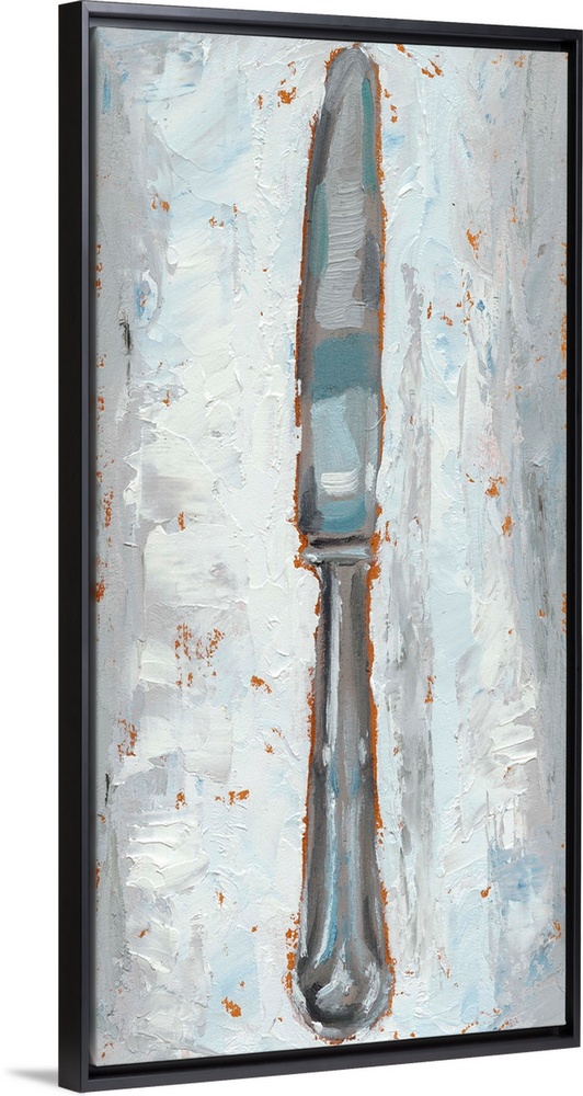 <p>Rustic painting of a knife made in cool tones with warm hints of orange popping out from underneath the layered paint.</p>
