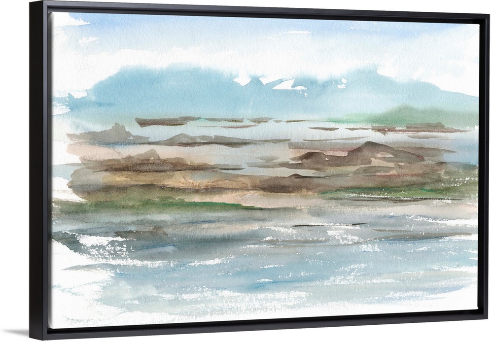<p>Semi-abstract watercolor painting of a mountain landscape with a lake.</p>