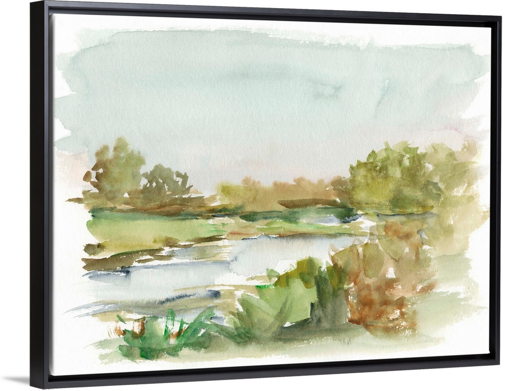 <p>Semi-abstract watercolor painting of a stream running through a green field.</p>