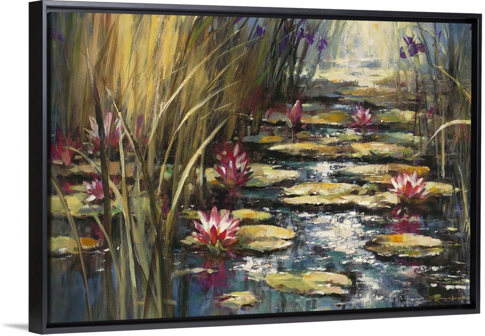 <p>Contemporary painting of pond with colorful waterlilies sitting on top of lily pads.</p>