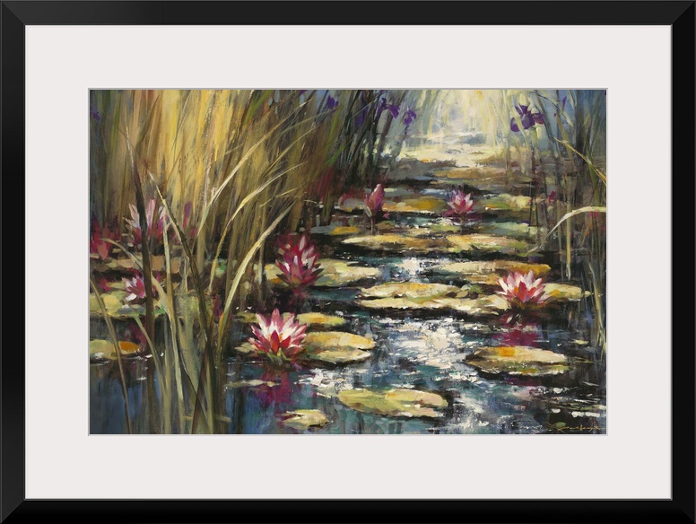 <p>Contemporary painting of pond with colorful waterlilies sitting on top of lily pads.</p>