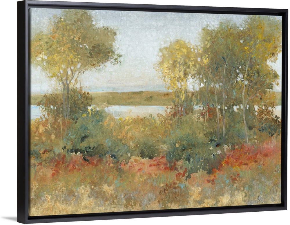 <p>Contemporary painting of an idyllic countryside scene with trees and a river.</p>