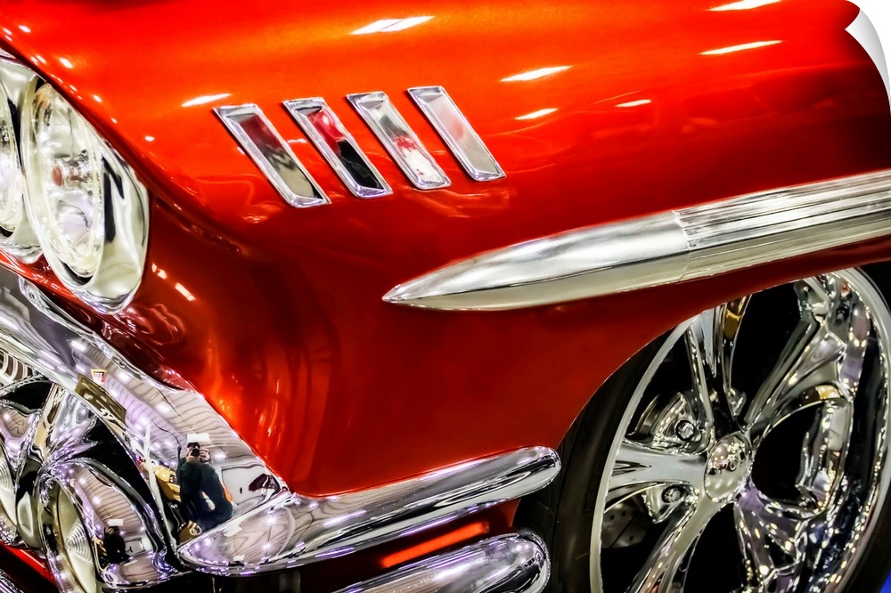 <p>Headlight and wheel rim detail of a bright red muscle car.</p>