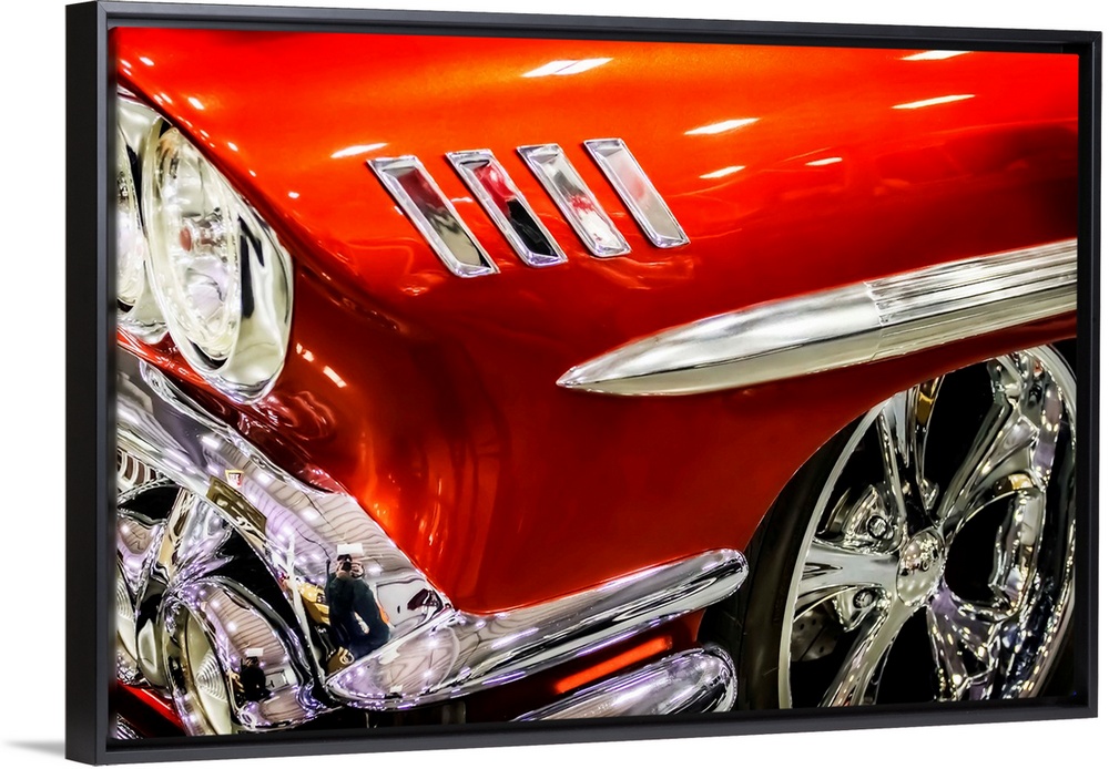 <p>Headlight and wheel rim detail of a bright red muscle car.</p>
