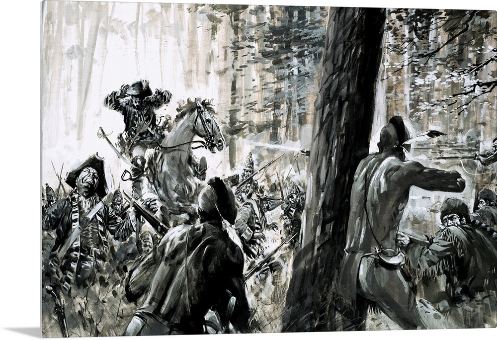 <p>Day of Defeat: Army of the Doomed. An Indian war cry signalled the start of one of the worst disasters in the history of the british army when, in 1765, General Edward Braddock was ambushed by French soldiers and fierce Canadian Indians. Original artwork from Look and Learn no. 646, 1 June 1974.</p>