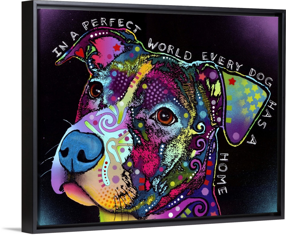 <p>Big contemporary art shows an illustration of a dog's head filled with vibrant colors and patterns with shapes including hearts, circles, and swirls. Artist places inspirational text around the dog's head and animal is set against a mostly bare background.</p>