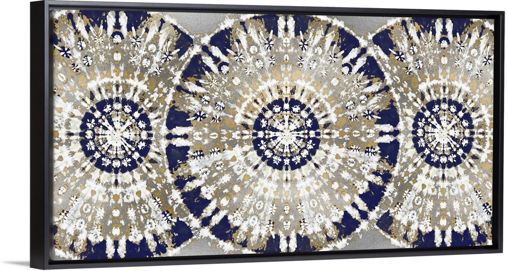 <p>Large abstract decor with three patterned, bohemian style circles overlapping in a row with blue, silver, gold, and white hues.</p>