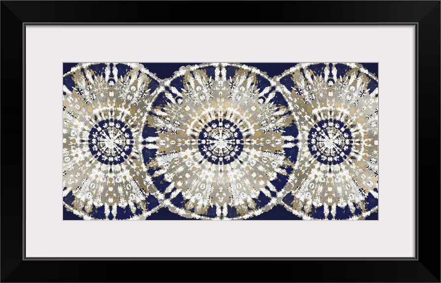 <p>Large abstract decor with three patterned, bohemian style circles overlapping in a row with blue, silver, gold, and white hues.</p>