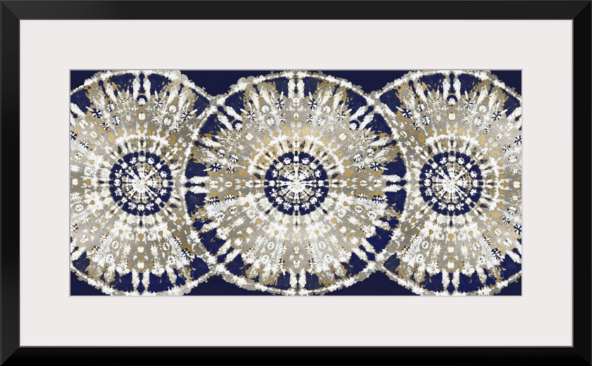 <p>Large abstract decor with three patterned, bohemian style circles overlapping in a row with blue, silver, gold, and white hues.</p>