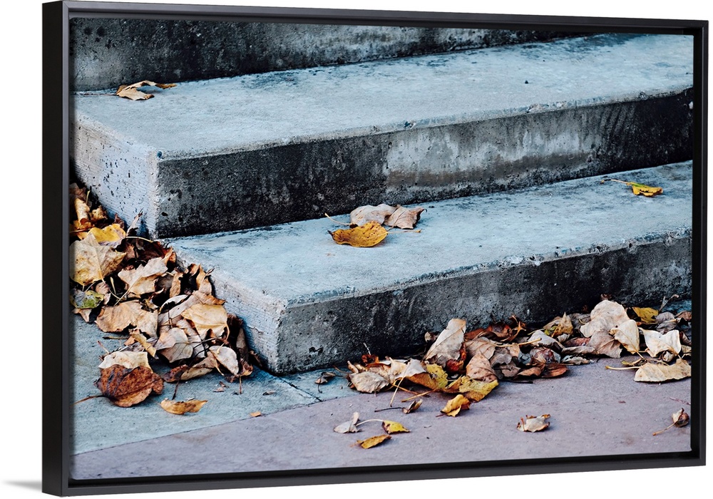 <p>Concrete stairs covered in dry, fallen leaves.</p>