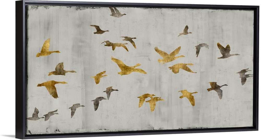 <p>Large decor with gold and silver birds in flight on a silver textured background.</p>