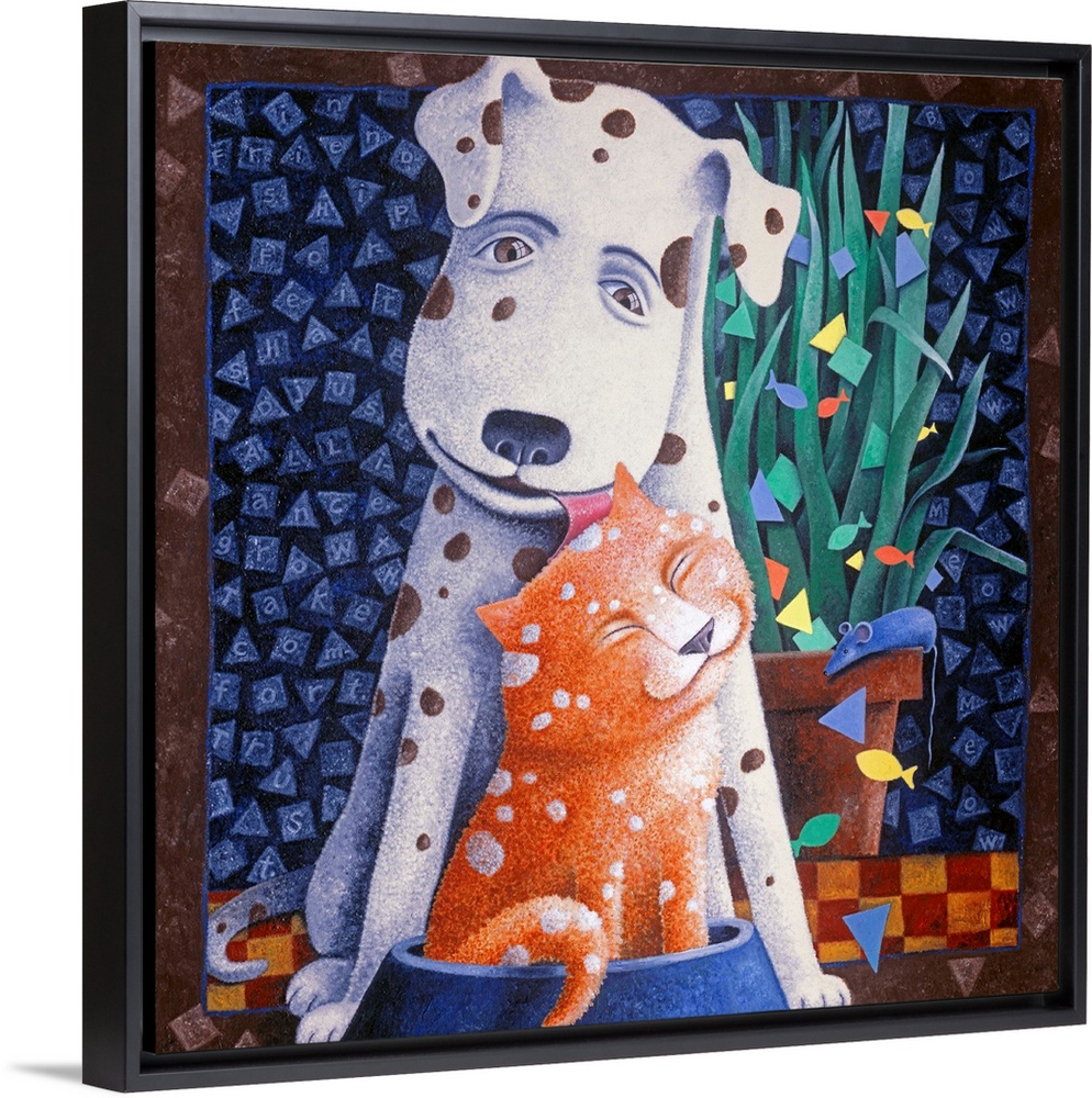 <p>Square painting of a white and brown spotted dog licking an orange and white spotted cat on the head.</p>