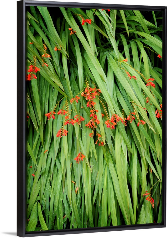 <p>Fine art photo of blades of grass pointing down with small orange flowers.</p>