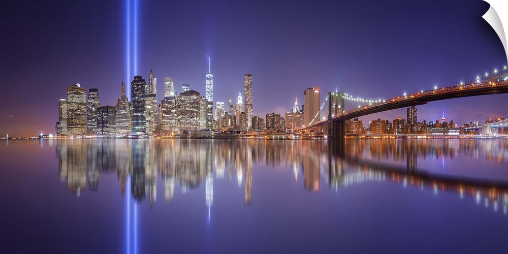 <p>A dynamic photograph of the NYC skyline with the Twin Towers memorial lights shining brightly.</p>