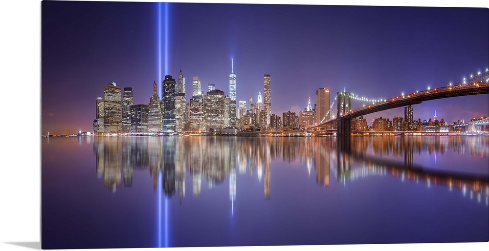 <p>A dynamic photograph of the NYC skyline with the Twin Towers memorial lights shining brightly.</p>