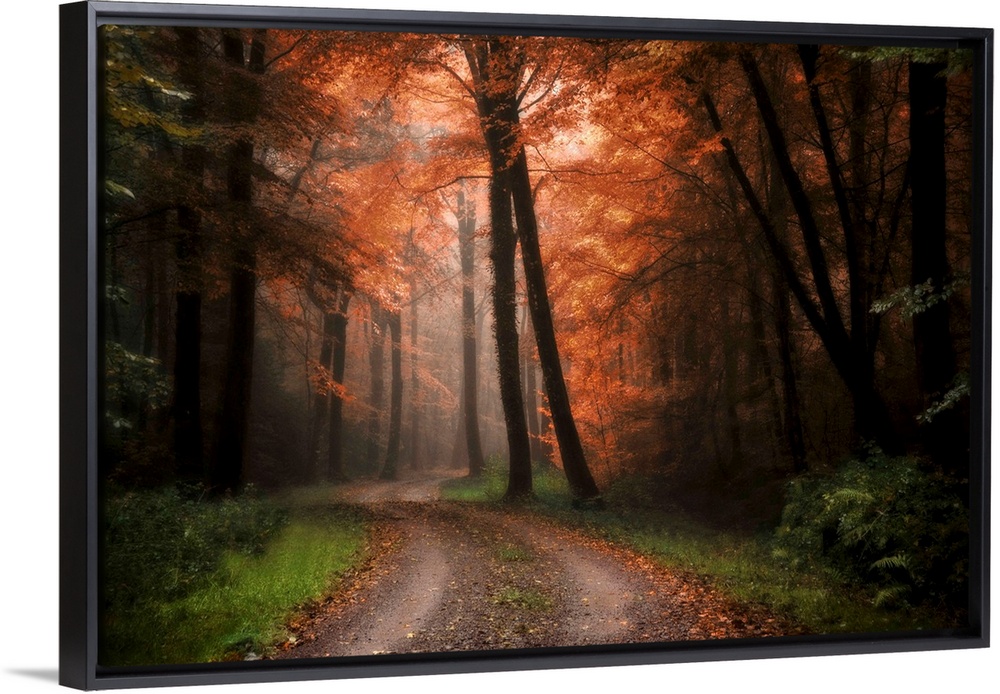 <p>A dirt path winds through a dark forest with some light shining through autumn colored trees.</p>