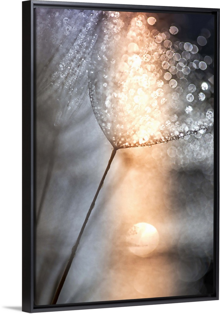 <p>Dew drops on a dandelion, with a shaft of orange light.</p>