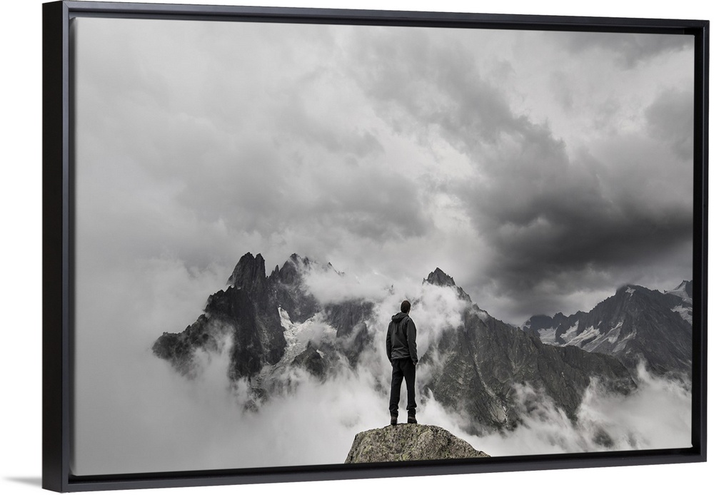 <p>A portrait of a man standing on a large rock formation staring off into the distance at a cloudy mountain range.</p>