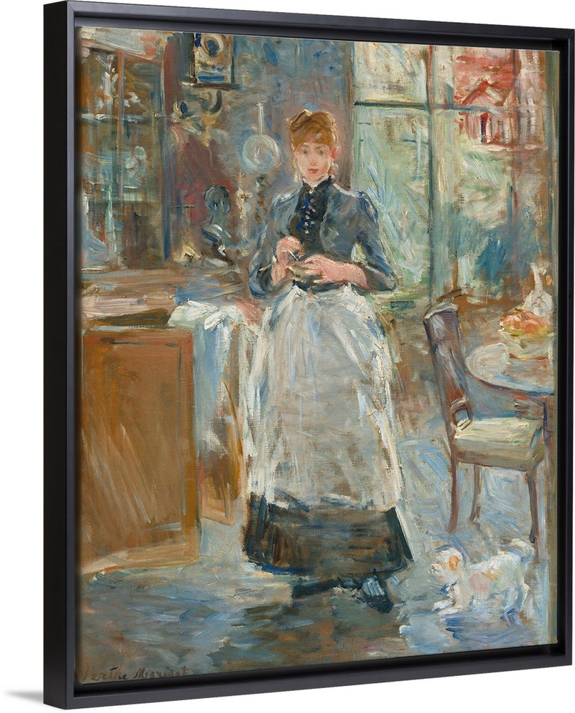 <p>In the Dining Room, by Berthe Morisot, 1886, French impressionist painting, oil on canvas. Morisot's bold brushwork animates this portrait in a light filled interior</p>