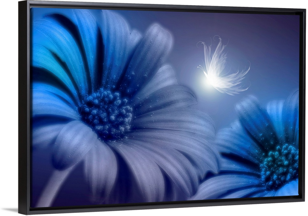 <p>Mixed media artwork of an up-close shot of two daisies with a glowing butterfly.</p>
