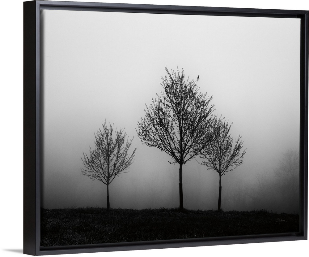<p>Photograph of three trees standing in front of a vast area of fog.</p>