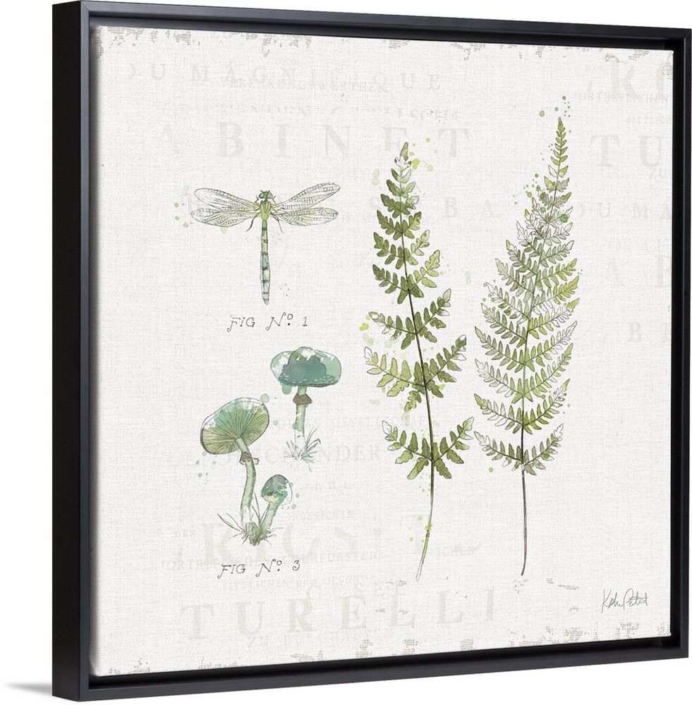 <p>Square watercolor painting of blue and green mushrooms, a dragonfly, and ferns on a white textured background with faint text.</p>