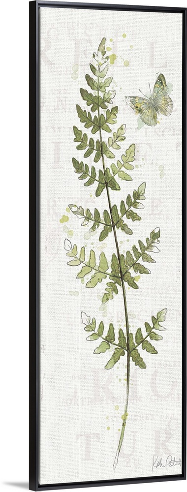 <p>Tall rectangular watercolor painting of fern leaves with a butterfly on a textured white background with faint text.</p>