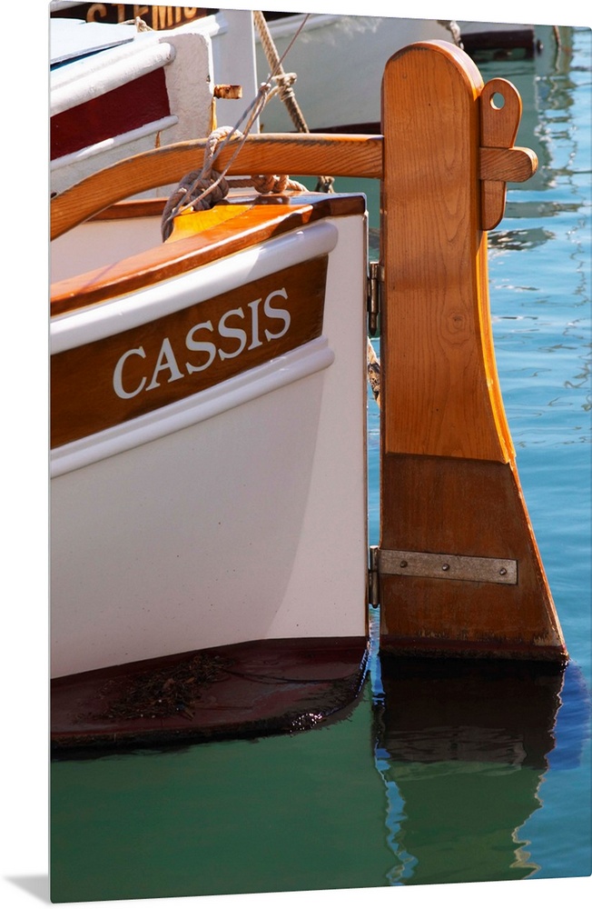 <p>In the harbour in Cassis village. A traditional style boat with wooden rudder marked with the name Cassis. Painted white. Cassis Cote d...Azur Var France Bouches du Rhone</p>