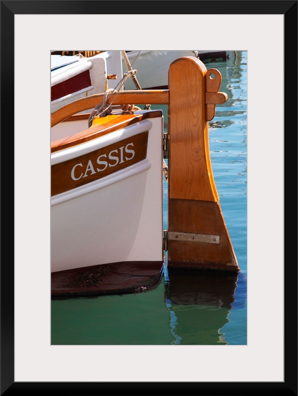 <p>In the harbour in Cassis village. A traditional style boat with wooden rudder marked with the name Cassis. Painted white. Cassis Cote d...Azur Var France Bouches du Rhone</p>