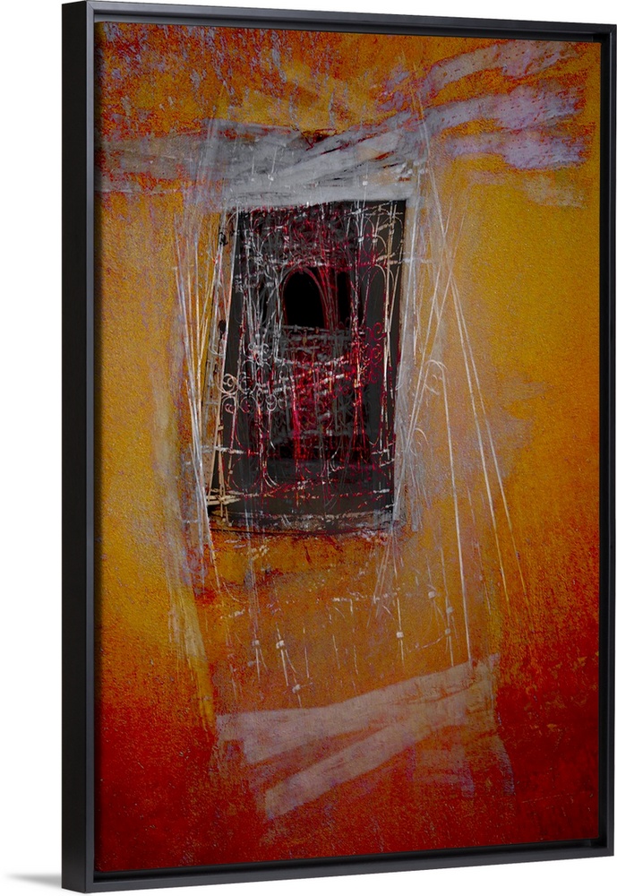 <p>An abstract expressionistic image of a window in a wall in golds, reds, silvers and blues.</p>