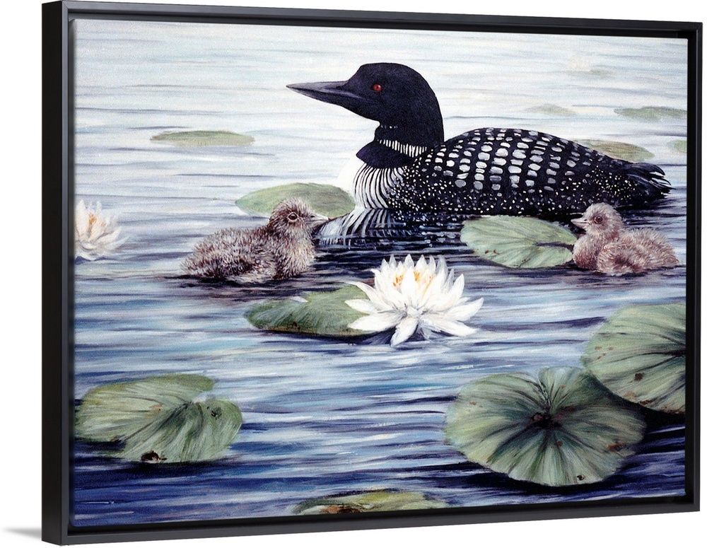 <p>Contemporary artwork of a loon swimming among lily pads.</p>