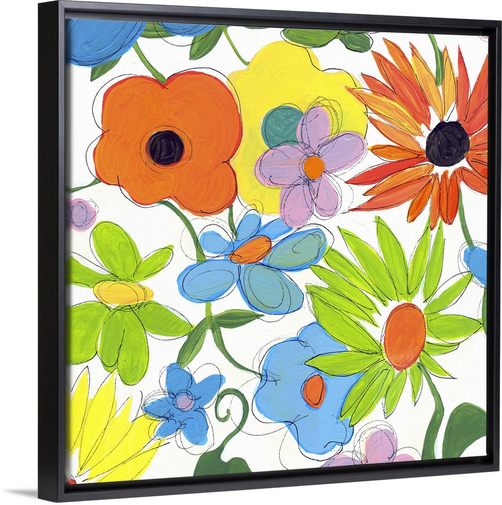 <p>Bright painting of different flowers on a square white canvas.</p>