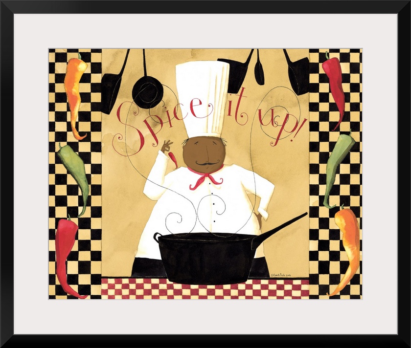<p>Happy chef standing in front of a sauce pan with steam rising from it. With the words "Spice it up" at the top of the image.</p>