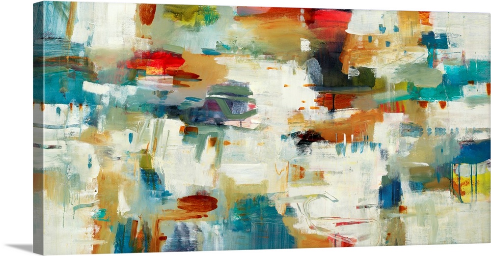 <p>Vibrant abstract painting featuring expressive brushstrokes, blending cool blues/turquoises with warm reds/oranges against a creamy white background. Dynamic, textured, and contemporary.</p>