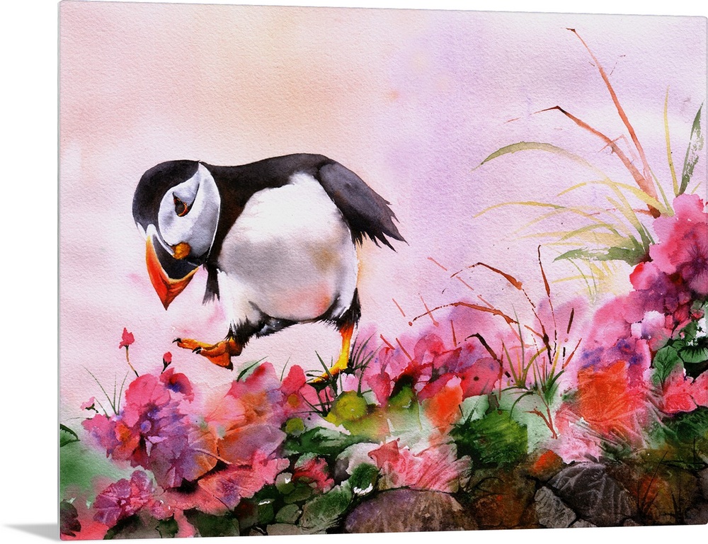 <p>A dancing Atlantic Puffin in amongst wild flowers, foliage and rocks.</p>