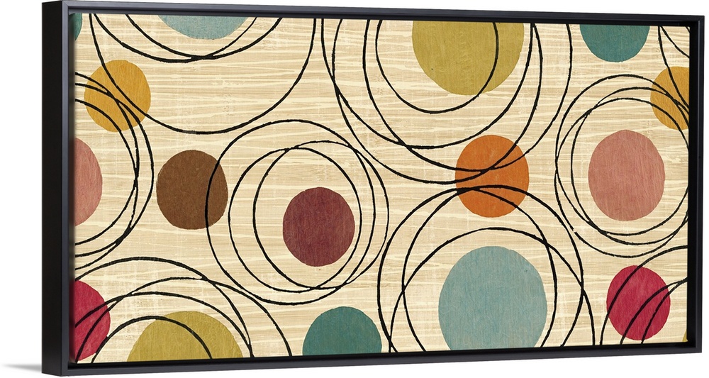 <p>Whimsical abstract painting of several different-colored circles and black rings on a neutral background.</p>