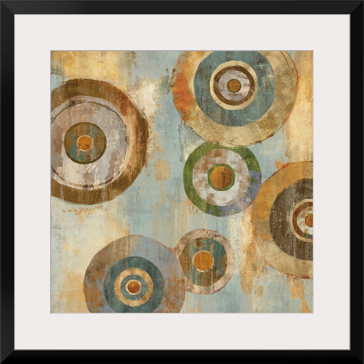 <p>Square abstract decor with colorful circles around circles on a blue, cream, and gold background.</p>