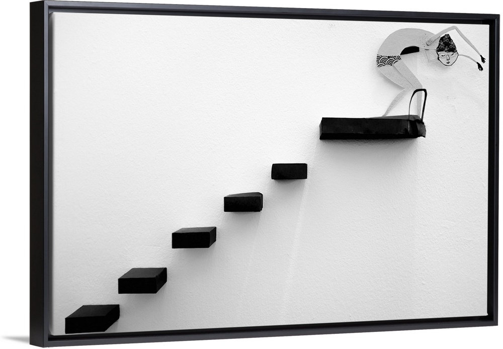 <p>Cut-paper figure of a diver at the top of a staircase on a wall.</p>