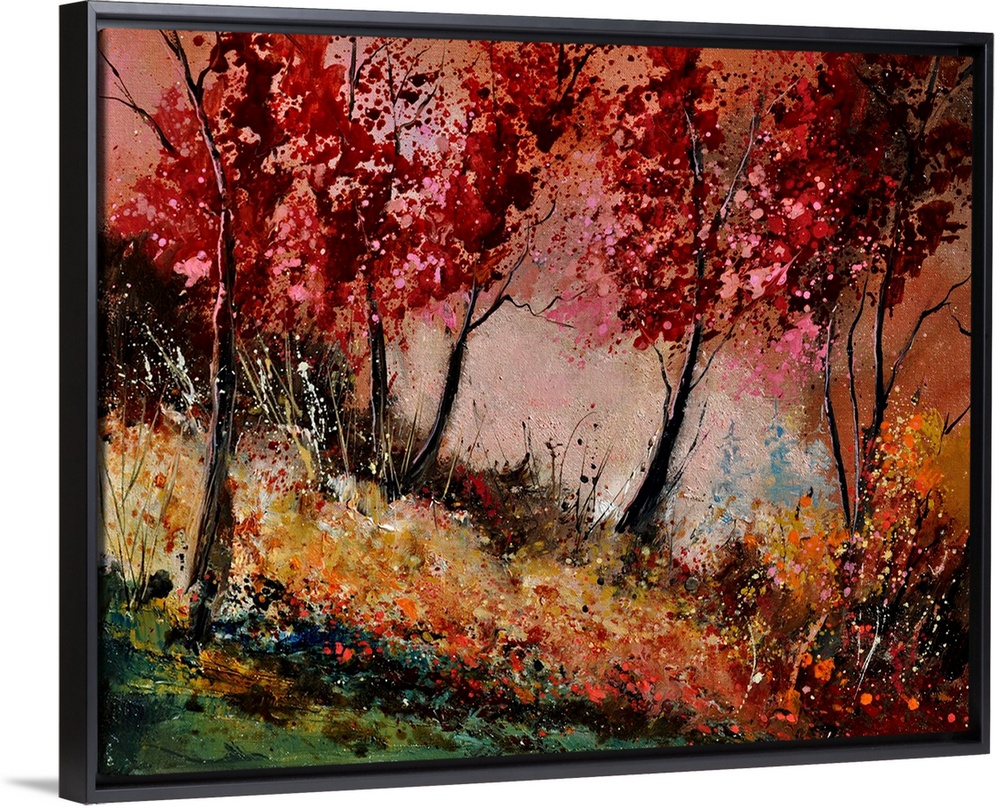 <p>Landscape painting of a group of red leaved trees in the fall with speckles of paint overlapping.</p>