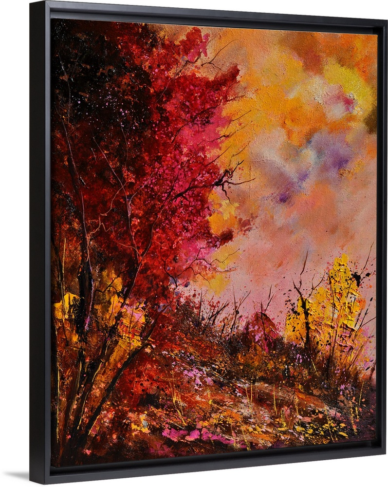 <p>Vertical painting of a group of red leaved trees in the fall with speckles of paint overlapping.</p>