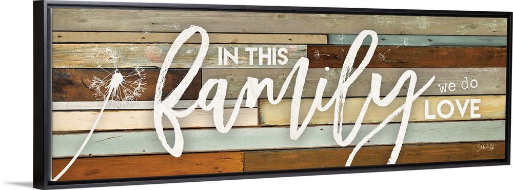 <p>"In This Family We Do Love" with dandelion design on a wood plank background.</p>
