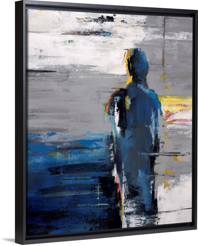 <p>Figurative art of a human silhouette standing next to a large square object, on a background painted with thick horizontal brushstrokes in various colors.</p>