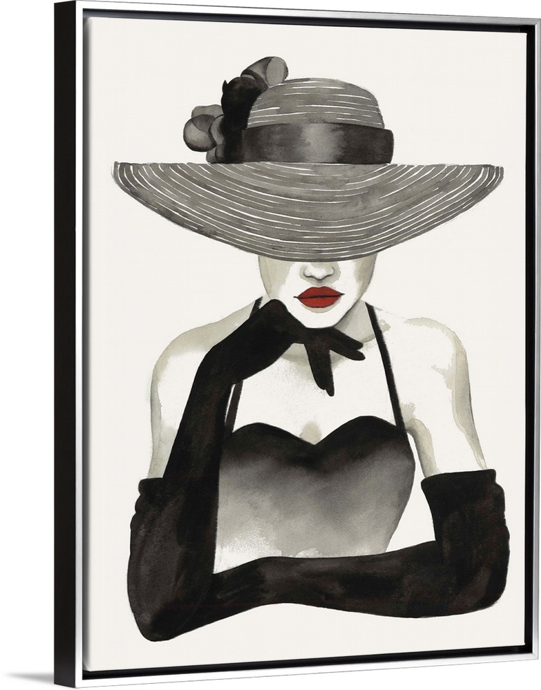 <p>Fashion docor image of a slender woman wearing elbow length black gloves and a large straw hat. Her eyes are covered, giving her an enigmatic look. The perfect look for a contemporary bathroom, bedroom or dressing room.</p>